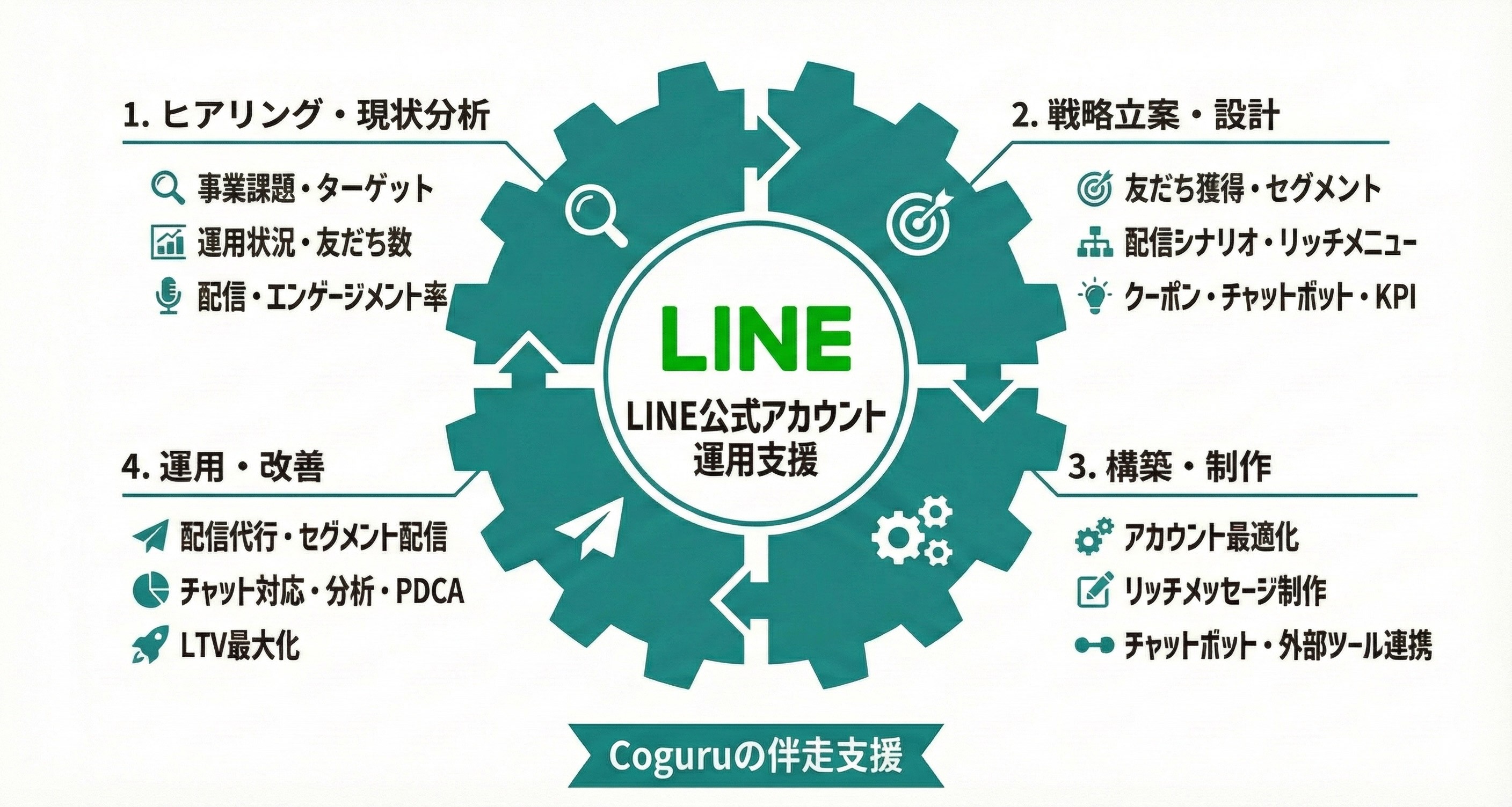 目的達成のための羅針盤です。友だち獲得から、顧客属性や行動に基づくセグメント設計、最適なタイミングで届ける配信シナリオ、直感的なリッチメニューのUI設計まで、成果を生むための基本戦略を包括的に策定します。